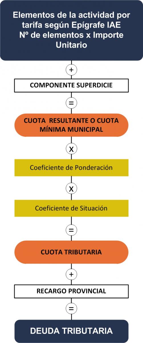 La cuota tributaria del impuesto se calcula aplicando las tarifas del impuesto de cada actividad, delimitando los componentes de la actividad gravados según las tarifas de su epígrafe a efectos del IAE; o bien, si es menor, la cuota mínima fijada, considerando las peculiaridades del componente superficie.