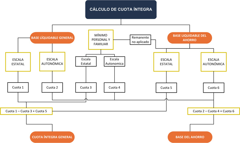 Partiendo de las bases liquidables, el siguiente paso es calcular los mínimos personales y familiares del contribuyente, que reflejan de manera objetiva la cantidad de la renta que el contribuyente destina para él y sus familiares. Es la manera en la que se adecúa el IRPF a las circunstancias personales y familiares del contribuyente reflejadas en su norma en los artículos 56 a 61 de la LIRPF.