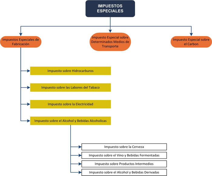 Tienen la consideración de impuestos especiales los Impuestos Especiales de Fabricación, el Impuesto Especial sobre Determinados Medios de Transporte y el Impuesto Especial sobre el Carbón.
