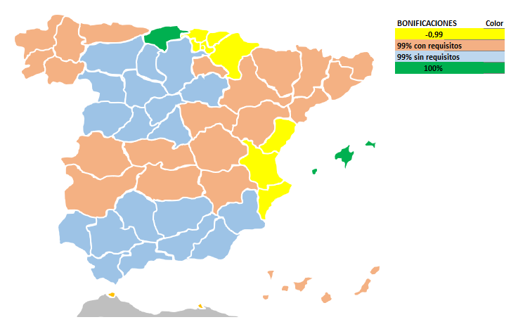 A continuación, podemos ver un mapa con las diferentes Comunidades Autónomas y las bonificaciones que tienen establecidas, partiendo desde un porcentaje inferior al 99% hasta el 100%.