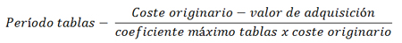 - Amortización sobre el coste de adquisición originario. El tipo máximo es el que muestran las tablas. Y el período máximo es: