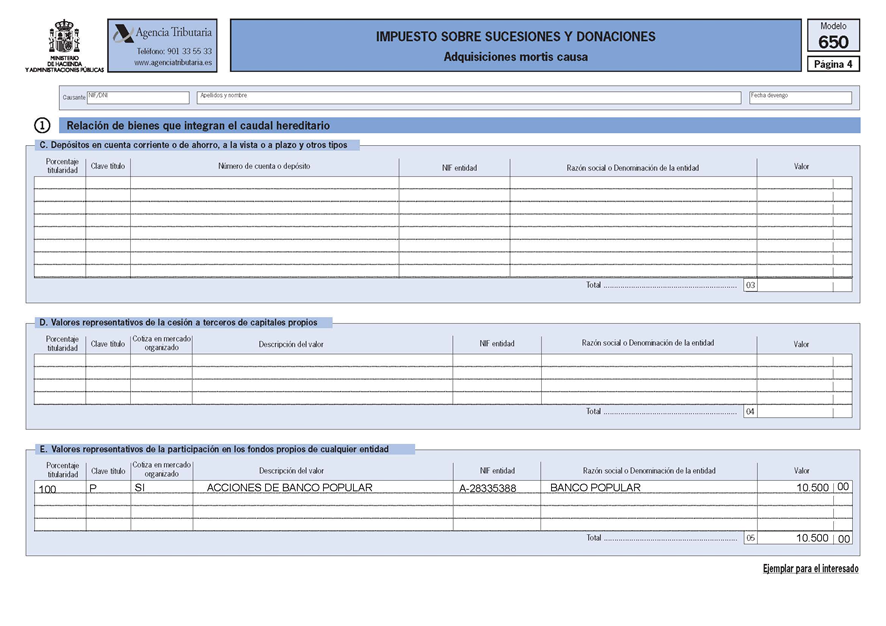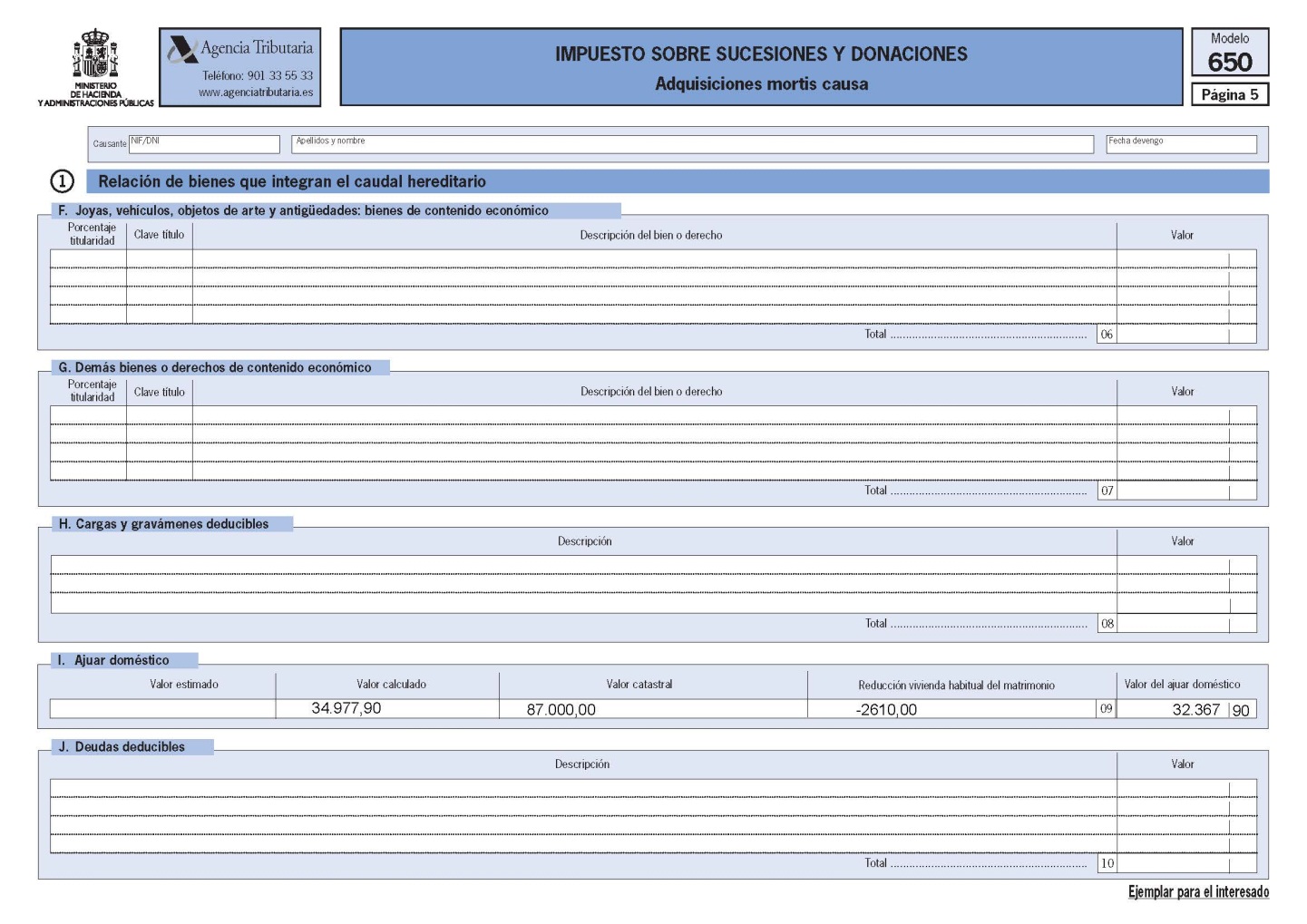 En nuestro caso, la viuda y cada uno de los hijos deberán de rellenar su página de autoliquidación, es decir, 3 en total. Esta página viene a corresponder con el modelo 650 de aquellas comunidades que tienen los dos modelos (660 y 650).