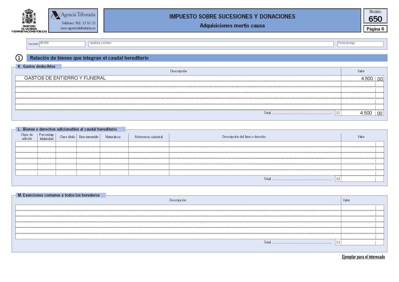 Se ha tomado a modo de ejemplo, el modelo 650 estatal para que sirva a título orientativo para todas las comunidades, aun sabiendo que el modelo estatal sólo se utiliza para casos muy concretos en que la liquidación del ISD no corresponda a ninguna comunidad autónoma, o para los territorios de Ceuta y Melilla. El modelo que correspondería liquidar en cada caso sería el que aprobase la hacienda competente en función del último domicilio del causante. Aun así, los distintos modelos autonómicos suelen ser muy similares a este estatal que tomamos de ejemplo.