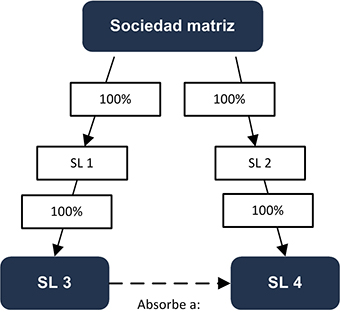 2. Fusión impropia indirecta: en este caso (artículo 49.2 Ley 3/2009). La sociedad absorbente es titular indirecto del 100% de las acciones o participaciones de la sociedad absorbida.