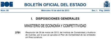 Se publica en el BOE de 10 de abril de 2013, Resolución de 26 de marzo de 2013, del Instituto de Contabilidad y Auditoría de Cuentas, por la que se aprueba el Plan de Contabilidad de las entidades sin fines lucrativos, con el con el objetivo de proporcionar a estos sujetos contables un marco operativo único que contenga todos los elementos necesarios para el registro de las operaciones que puedan realizar, incluidas las que se deriven, en su caso, de la actividad de carácter mercantil o con ánimo de lucro.